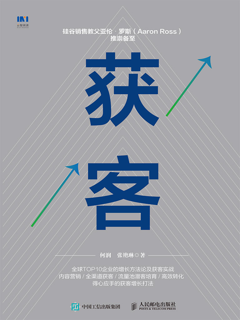 内容提要在全球营销技术爆发之势,如何加速营销技术落地中国?以微信为代表的社交营销生态,使国内企业和用户的关系在线化领先于国外。如何立足“社交”,布局全渠道,高效获取流量?中国市场如何将营销的感性与理性相结合,持续稳定转化潜在用户?本书提出①的“鱼池养鱼论”给出解决方案:首先,通过丰富的内容类型,深入不同获客场景,制造流量;其次,建立社交端营销自动化流量池,汇聚全渠道流量;再次,明确用户画像及用户购买旅程阶段,从流量池中找出优质商机及用户;最后,在提高转化的同时进行线索培育,最终提高线索到签约的效率,从而实现高效获客。“鱼池养鱼论”的获客方法论助力致趣百川赢得多个灯塔级别的用户:微软、腾讯、联想、SAP、金蝶等。这些深谙中国营销挑战之复杂的用户,用他们的选择证明了本书B2B营销技术之领先。